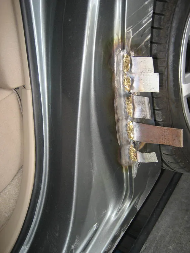 クォーターパネルに端切れの鉄板を溶接して粗だしをして板金にて復元します。