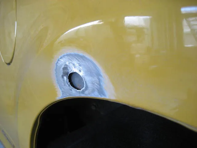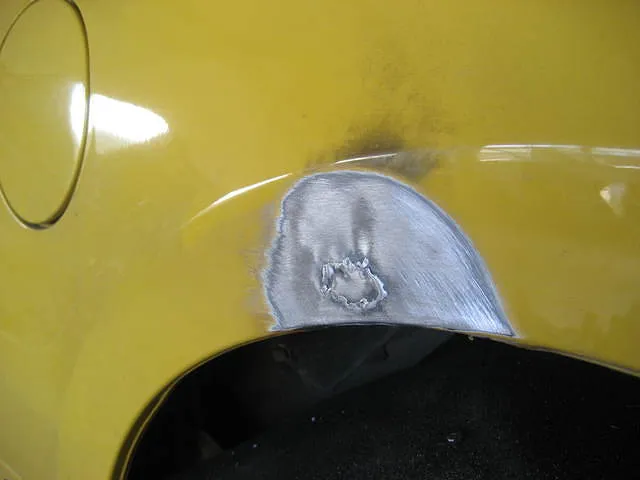錆びによる腐食の為、塗装を剥がすと穴が開いている状態。この錆びを部分的に修理します。