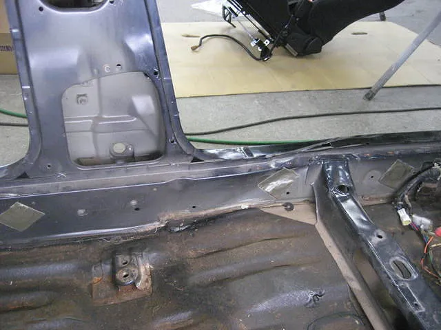 表面のパネルを取外すと、ご覧の様にサイドシルからホイルアーチにまで損傷があります。