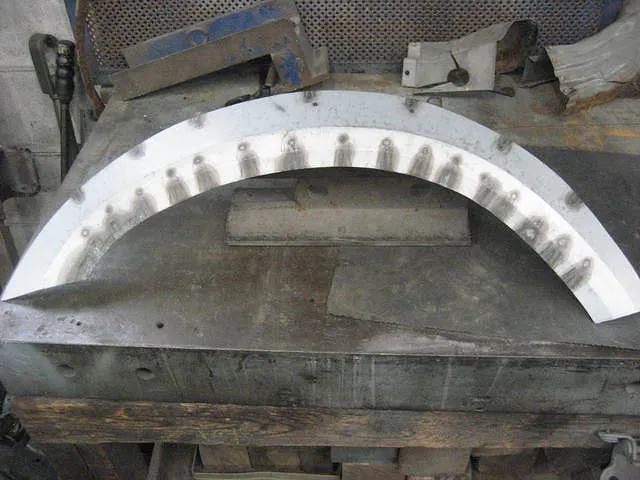 フェンダーの製作。現車より寸法を測定して一枚の鉄板より製作します。