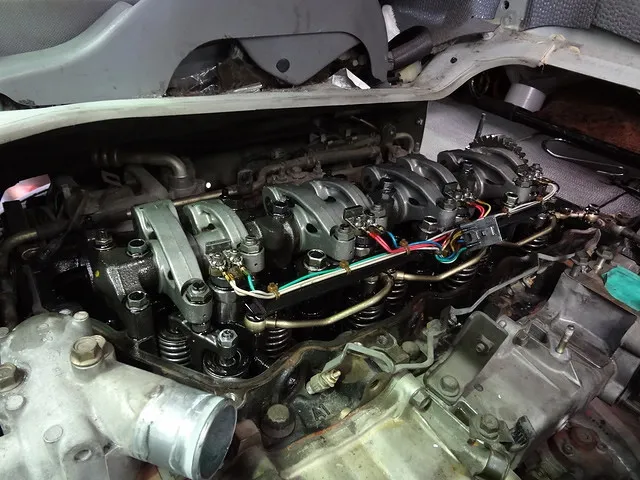 エンジン上部のヘッドカバーも取外しての作業。この車両はオイルのメンテナンスが良いため、走行距離は16万㎞走行していますがエンジン内部はとてもきれいです。